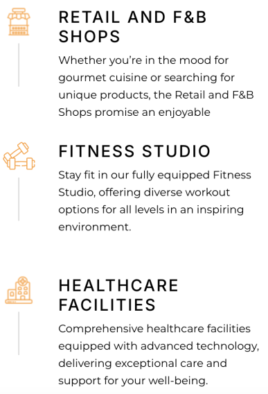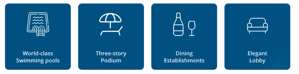 Residents will enjoy resort-style facilities, including a three-story podium, an elegant lobby, and world-class swimming pools.